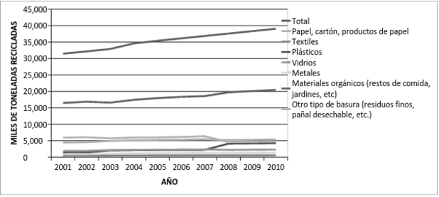 A pesar de que el volumen de RSU que se recicla en el País se ha incrementado en los últimos años, aún resulta bajo. De acuerdo con la SEMARNAT, en el país se recicla un promedio 4.8% del volumen de RSU generados; no obstante, esta cifra alcanza el 10% en virtud de que muchos de los RSU susceptibles de reciclarse se recuperan antes de llegar a los sitios de disposición final, tanto en los contenedores como en los vehículos de recolección. Los materiales que más se recuperan son, papel, cartón y productos de papel, vidrio, pet, aluminio y plásticos.