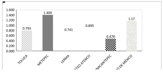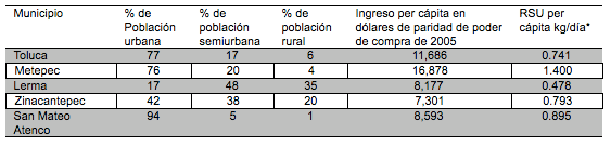 Si se calcula la generación de RSU por habitante, se observan diferencias importantes, resultado básicamente de la influencia de calidad de vida, niveles de ingreso y grado de urbanismo, entre otros. De la zona de estudio, el municipio de Metepec es el que muestra el promedio más alto de RSU por persona (1.4 kg/per cápita) y que está por arriba de la media estatal, le sigue San Mateo Atenco (0.895 kg/per cápita), Toluca (0.793), Lerma (0.741) y Zinacantepec (0.478). Cabe mencionar que en San Mateo Atenco el promedio se eleva, debido a la presencia de los tianguis de zapatos.