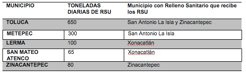 En Toluca y la zona conurbada, los vehículos recolectores acuden directamente al sitio de disposición final con excepción de San Mateo Atenco, que es el único que cuenta con una estación de trasferencia en donde los RSU se almacenan y se separa un porcentaje hasta que son transportados al sitio de disposición final (ver tabla 1).