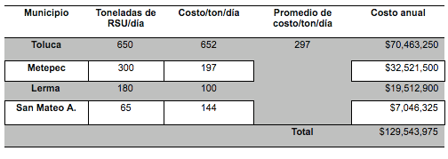 De acuerdo con las entrevistas aplicadas en la zona conurbada de Toluca, el costo promedio para un ayuntamiento de recolectar y desechar una tonelada de RSU es de 297 pesos, aunque puede ir desde 100 hasta 652 pesos, tomando en cuenta el pago a empleados, parque vehicular e inversión y mantenimiento del sitio de desecho final.