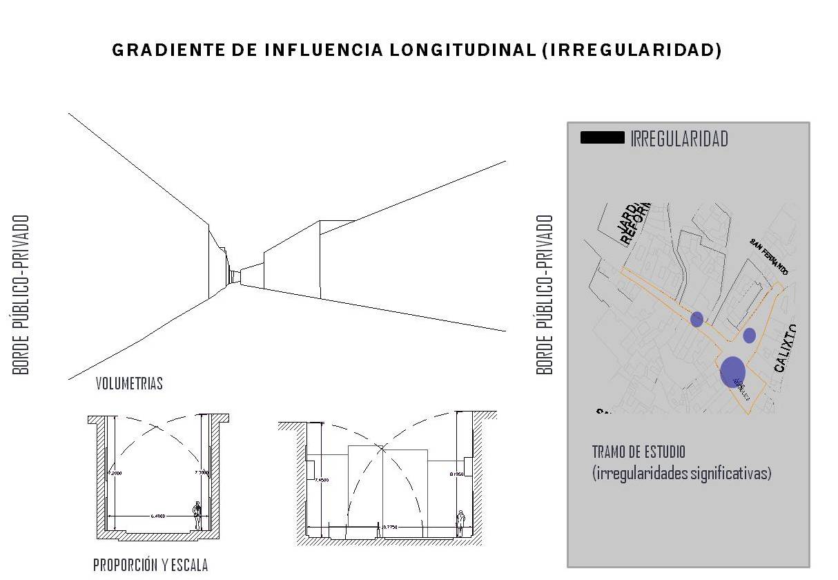 c) Irregularidad: el Borde público-privado, a lo largo de su superficie, puede plegarse, originando entrantes y salientes con respecto a la alineación de la calle (lo que puede generar, principalmente actividades estáticas y de permanencia).
