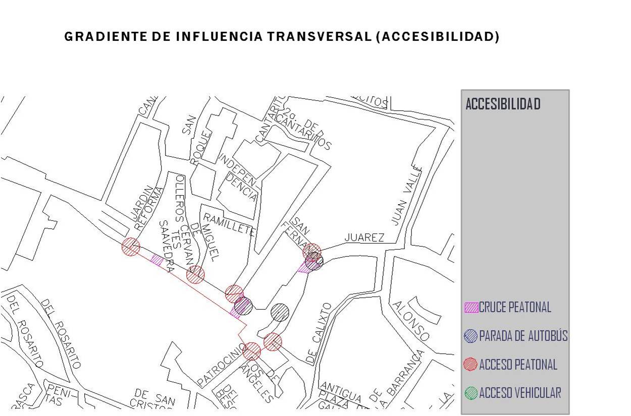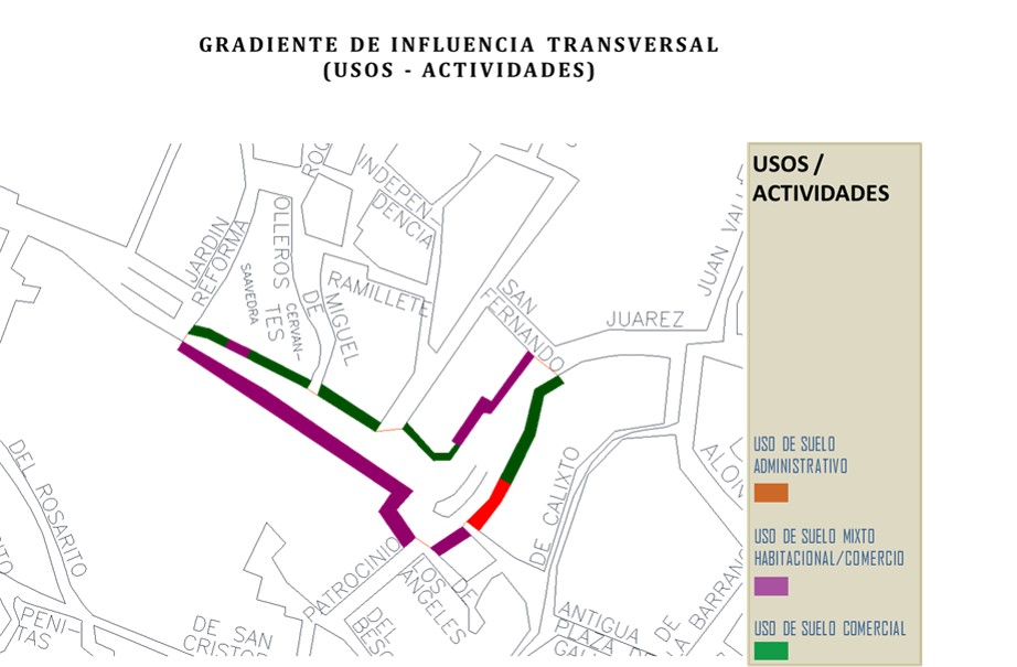 1. Gradiente de influencia longitudinal (paralelo al borde): es consecuencia de la variación del borde durante un recorrido por el espacio público de manera lineal y, tiene influencia sobre el comportamiento del peatón acorde a las condiciones funcionales y físicas del trayecto.