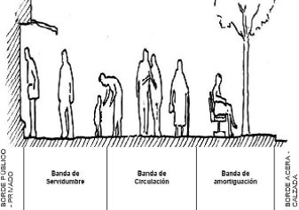 c) La banda de amortiguación, situada entre el resto de la acera y la calzada, donde se disponen, generalmente, la vegetación y el mobiliario urbano. Esta última banda, no necesariamente debe de ser continua, puede estar constituida por tramos independientes conectados por la banda de circulación. Su ancho depende del tamaño de los elementos que se dispongan en ella (Gil, 2007).