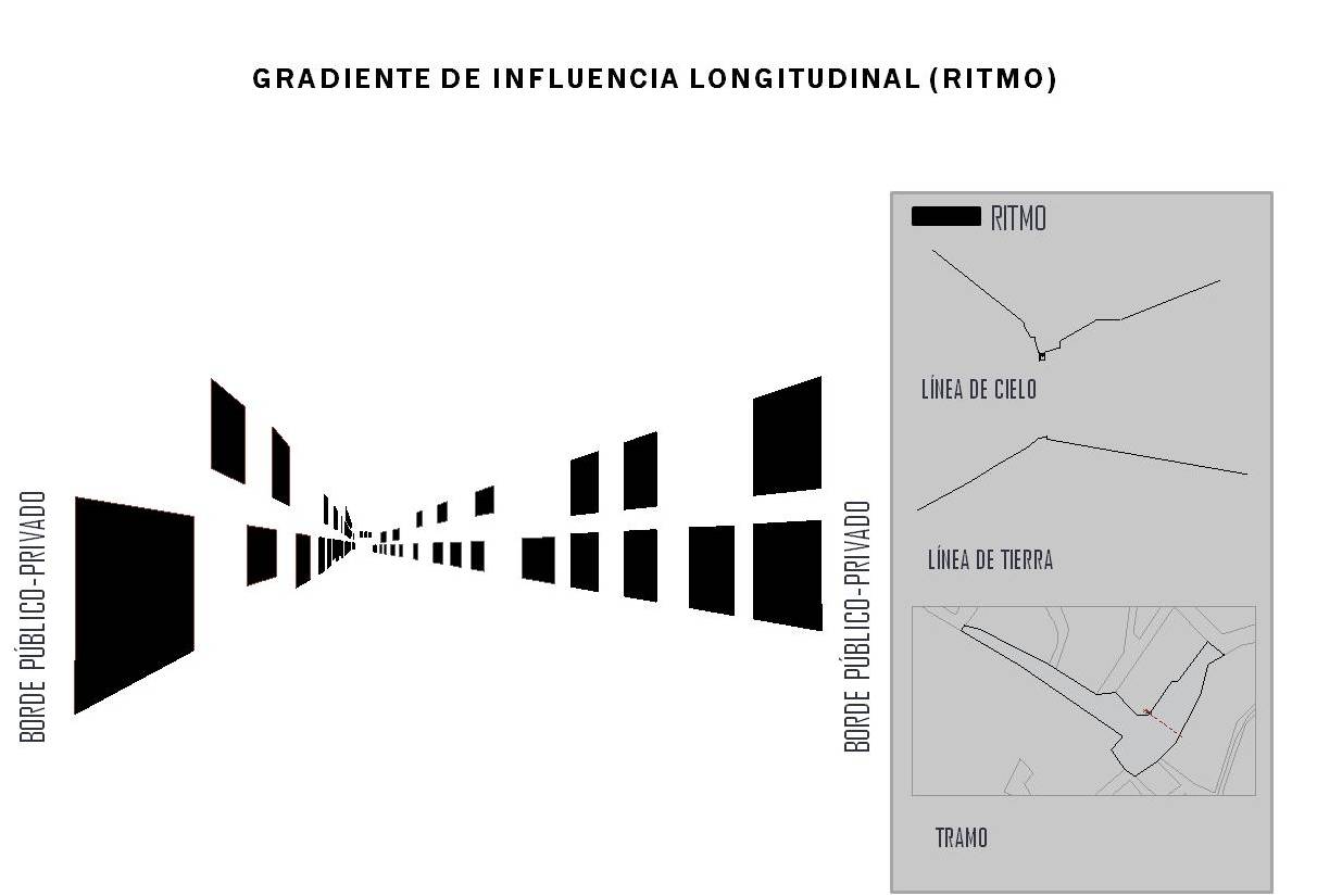 Se determinaron las siguientes categorías de análisis y variables para realizar el estudio del Borde público-privado. La integración del espacio público con el privado, tendría sobre el peatón un grado de influencia variable, de acuerdo al sentido de su recorrido, tanto en sentido transversal como en sentido longitudinal. A lo que se le ha denominado “Gradientes de influencia”.