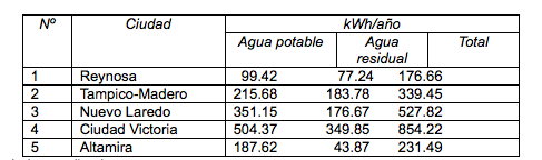 Para el consumo del agua se consideran datos estadísticos de solo seis ciudades proporcionados por la Comisión Nacional del Agua (cna) del 2000 al 2010 (no se pudieron contar con datos de Maramoros) considernando una equivalencia de 1 kWh/m3h para agua potable y la residual de 0.7 kWh/m3h (Fundación opti, 2010), ver cuadro 2 observándose que en Ciudad Victoria es el de mayor consumo comparado con Reynosa que es el menos consumidor de agua potable, detectándose un área de oportunidad sobre este tema.