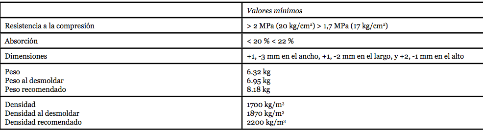 F. Es necesario que los bloques sean de caras planas o al menos lo mayor posible. A los siete días de fabricados, los btc deben cumplir con las especificaciones indicadas en la tabla 1.