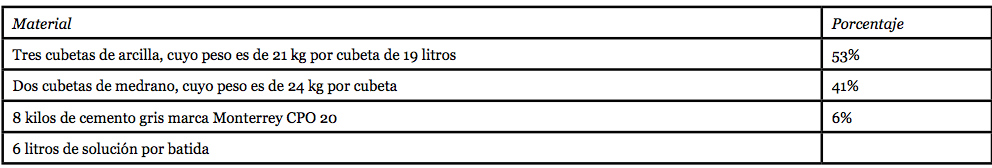 Se usaron los siguientes porcentajes, dado que la arcilla de la zona es de baja plasticidad; de cada batida salen 14 bloques.