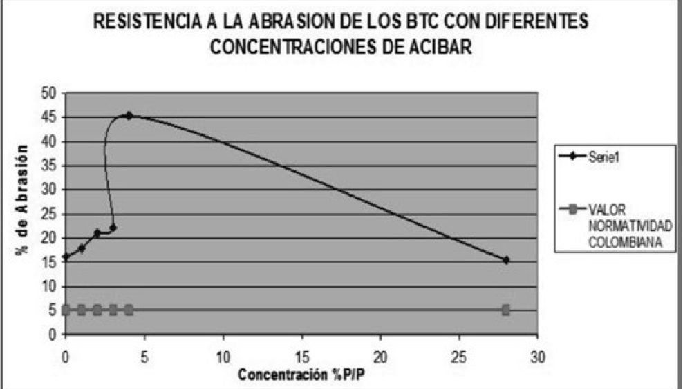 Abrasión o durabilidad: se determina la duración de un btc seco y pesado inicialmente bajo lo descrito en la ntc 5324 epígrafe 3.4.3 (icontec, 2004). Para la prueba de durabilidad se observaron las características físicas del bloque antes y después del experimento. De acuerdo con esta norma, la periodicidad de la prueba estará en función de la fecha de producción de especímenes.