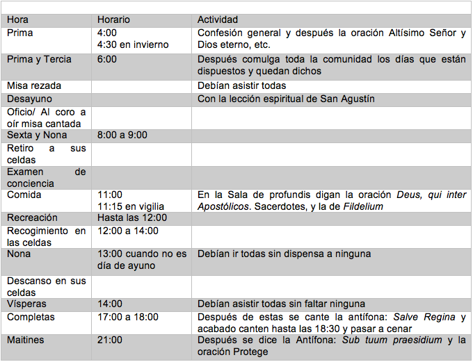 La Regla que observaron los conventos de Santa Catarina y Santa Inés de la ciudad de Puebla y que se supone fue de los instrumentos que se usaron en el Convento de Pátzcuaro, indica la manera en que se debían de realizar las actividades a lo largo de un día de vida cotidiana el cual comenzaba a las 4:00 am. con el rezo de la Prima, a las 6:00 era la Tercia, a las 8:00 am la Sexta y Nona, seguido de varias actividades hasta que a las 21:00 h. que se rezaba Maitines, posteriormente seguía el descanso en sus celdas para continuar al día siguiente con la misma rutina (Tabla 3).