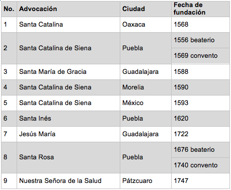 Tomando como referencia a Josefina Muriel, las fundaciones hechas por la orden dominica de mujeres en la Nueva España fueron establecidas en las ciudades de Oaxaca, Puebla, Guadalajara, Morelia, México y Pátzcuaro.