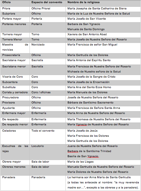 Las actividades de la vida cotidiana se realizaban bajo la coordinación de las religiosas que eran elegidas en capítulo cada tres años (y reiteradas en capítulo intermedio) a través de votos escritos y secretos, en un acto supervisado por el prelado o vicario (Regla, 1773:130-131), los cargos eran asignados en ese acto; para el convento de Pátzcuaro se presenta la tabla 2 con la información del capítulo intermedio celebrado el 9 de marzo de 1787.
