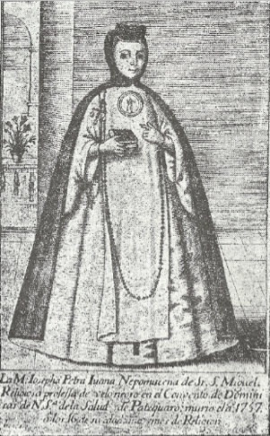 En documentos manuscritos e impresos históricos sobre el convento, especialmente en algunos del siglo XVIII se encuentra registrada información que da cuenta de la existencia de algunas celdas particulares en el convento patzcuarense; por ejemplo, el caso de la religiosa Josepha Petra Juana Nepomuceno de Señor San Miguel (figura 1), quien profesó el 17 de abril de 1757 y en el “siglo” se llamó Petra Arrambide. Ella fue una religiosa joven, pero importante en el convento, a su muerte el gestor del convento Joseph Antonio Eugenio Ponce de León escribió una carta a las religiosas en la que menciona varios aspectos y datos de esta religiosa.