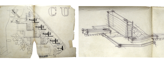 Figura 4. A la izquierda, el plano de conjunto de las Habitaciones tipo para estudiantes. A la derecha, el croquis volumétrico de la propuesta, CA. 1951. Una de las 2 propuestas preliminares estudiada y descartada.