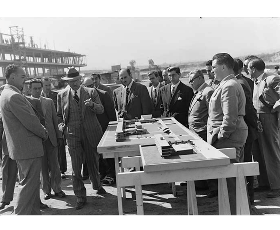 Figura 8. Fotografía del presidente Miguel Alemán viendo maquetas, entre éstas la Unidad de habitaciones para estudiantes en primer plano.