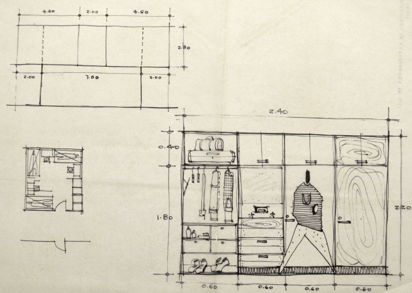 Figura 3. Croquis de célula de habitación más desarrollada, CA. 1951. Se observa que la célula se pensó para tres estudiantes y que el mobiliario jugó una parte importante en el diseño del espacio.