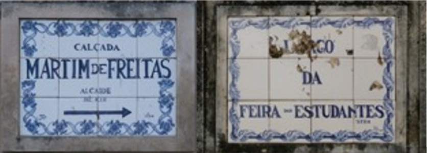In this article, Coimbra’s toponymy, its shape and identity will be approached. The city’s contemporary toponymy signage has been defined by the city council. Traditional Portuguese ceramic tiles were chosen and described as an ornamental and utilitarian piece and the result of the process of an artisanal activity, which remounts to the long pottery tradition of the city (Nunes, 2008). In all the places where it is not possible to stick signage on a wall, it should be placed on a Stone of Ançã pillar, which also characterises this region. This way it does not create any conflicts with the aesthetics of new constructions (Nunes, 2008). The main goal of the Coimbra’s toponymy commission is to preserve the memory of traditional and natural places, costumes, happenings, institutions, people or other reasons, things or objects that should be perceived as an example (Nunes, 2008).