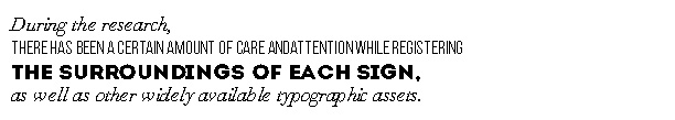 During the research, there has been a certain amount of care and attention while registering the surroundings of each sign, as well as other widely available typographic assets. Warnings, posters, advertisings are also a part of each place’s identity, so it is possible to interpret that information as an open-air museum, or a museum of the every day, which is bringing a radical transformation of the function of art (Reis, 2012), because if typography makes any sense, it is visual and historical (Bringhurst, 2004). In the course of history, typography has always been an activity at culture and written communication’s service (Balius, 2013).