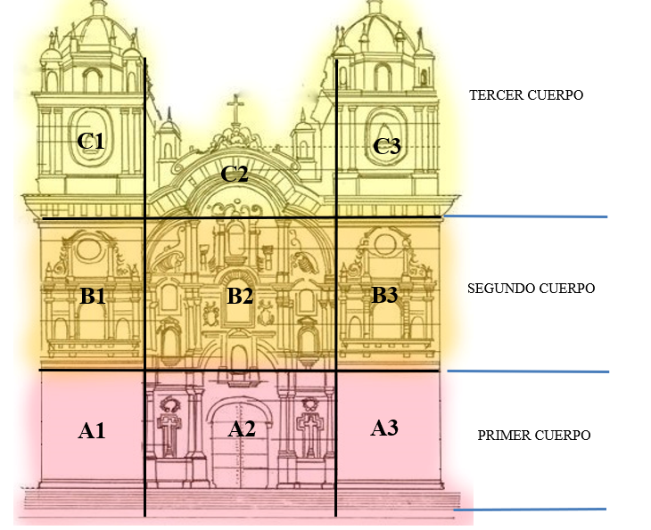 Por la técnica de observación y catalogación de patologías presentes de formas extrínsecas en el material pétreo (químicas, físicas, mecánicas y biológicas) de la fachada retablo de la iglesia de la Compañía de Jesús, se identificó tres cuerpos con sus respectivos sectores (croquis 1), dando los siguientes resultados: