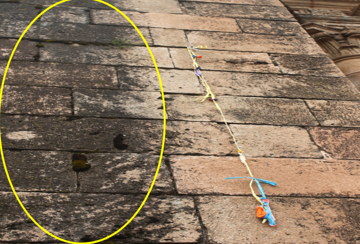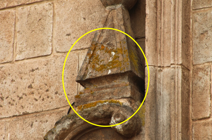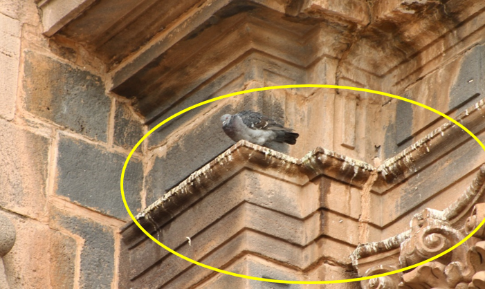 Excretación de aves: Se produce principalmente por las palomas que generan azufre y amónico al momento de depositar sus heces, y que al mezclarse con la humedad (agua) se genera ácido sulfúrico, un problema que deteriora la parte intrínseca y extrínseca del material pétreo (figura 9) (Broto y Mostaedi, 2005-2006: 21).