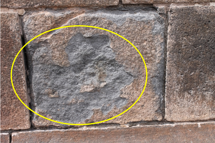 Costras negras: Procedentes de la eflorescencia mezclado con el dióxido de carbono, monóxido de carbono que produce el parque auto motor, y que el material pétreo va captando las partículas generadas por estos, volviendo que el material pétreo se torne oscuro (figura 4) (Broto y Mostaedi, 2005-2006: 22).