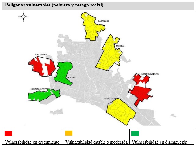 Áreas donde la vulnerabilidad (ambiental, social, económica y política) materializa una situación de exclusión ya consolidada que dificulta la regeneración de determinadas áreas urbanas. Donde se presentan polígonos de viviendas o áreas de urbanización marginal realizadas sin una planificación ni dotación de equipamientos apropiados.