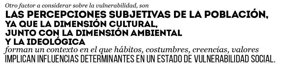 Otro factor a considerar sobre la vulnerabilidad, son las percepciones subjetivas de la población, ya que la dimensión cultural, junto con la dimensión ambiental y la ideológica forman un contexto en el que hábitos, costumbres, creencias, valores implican influencias determinantes en un estado de vulnerabilidad social.