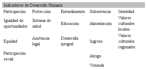Si no se poseen estas oportunidades esenciales, muchas otras alternativas continuarán siendo inaccesibles; pero el desarrollo humano no termina allí; otras oportunidades, altamente valoradas por muchas personas, van desde la libertad política, económica y social, hasta la posibilidad de ser creativo y productivo, respetarse a sí mismo y disfrutar de la garantía de Derechos Humanos (tabla 2).