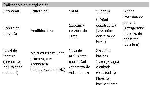 De alguna forma también nos habla de la desigualdad social, ya que los bienes del desarrollo no llegan de la misma forma a toda la población. Así, el concepto de marginación se aplica a través de los componentes de educación, salud, condiciones de la vivienda, ingreso y bienes en la vivienda (tabla 3).