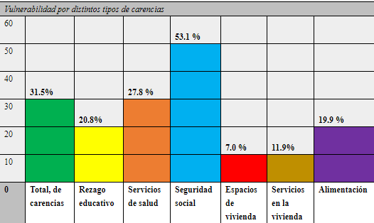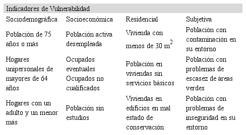 En este sentido, la vulnerabilidad está asociada también a la imposibilidad de disfrutar diversos satisfactores esenciales, muchos de los cuales son provistos por el Estado (tales como acceso a servicios de saneamiento o la seguridad pública), o que son considerados fundamentales por formar parte de los derechos humanos, económicos, sociales y culturales, lo cual involucra el análisis de distintas condiciones e indicadores de tipo social, económico, residencial, etc., por lo que en el trabajo realizado se propuso agrupar dichas condiciones en tres tipos de vulnerabilidad, la socio-demográfica, la socio-económica y la socio-espacial que permitiera delimitar territorialmente áreas vulnerables.