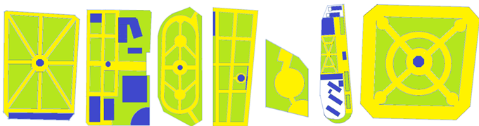 Fuente: Elaboración propia (2020), con base en Google Earth. Los dibujos no están a escala entre sí; las partes más obscuras representan los kioscos (círculos) o las invasiones (rectángulos).