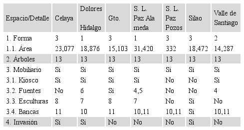 Área: La mayoría de los casos estudiados presentan una superficie mayor a una hectárea y media, siendo la excepción la alameda de Pozos, que apenas supera los 300 m2. El área más grande la presenta la Alameda Melchor Ocampo de San Luis de la Paz, con más de tres hectáreas de superficie.