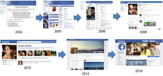 Fuente: Elaboración propia (2020), a partir de Google Images.El diseño de esta red social ha sido modificado a lo largo del tiempo por factores de índole social y tecnológico, retomando elementos icónicos para su interacción y desarrollando nuevos elementos, como el uso de emojis, y la adaptación a múltiples dispositivos con diferentes tamaños de pantallas, generando interfaces cada día más incluyentes utilizando todos los recursos posibles (audio, video, sensores, etc.). La emisión de los mensajes muta junto a las interfaces y la interacción de acuerdo con cada dispositivo. La diferencia en busca de la interpretación de una pintura, fotografía e incluso el cine de forma gráfica y visual es la bidimensionalidad que poseen respecto a los entornos de interfaces gráficas de usuarios que cuentan con más perspectivas de las que conocemos iniciando con los recursos de audio y 3D, si bien se retoman algunas prácticas iconográficas, estamos hablando de un nuevo paradigma de interpretación que ha evolucionado y se ha adaptado junto con los dispositivos.