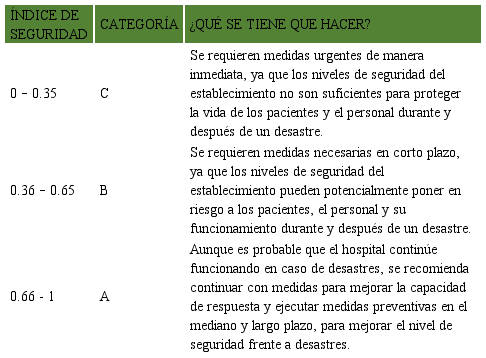 Lo que se interpreta como que se requieren medidas necesarias en el corto plazo, debido a los niveles actuales de seguridad del establecimiento pueden potencialmente poner en riesgo a los pacientes, el personal y su funcionamiento durante y después de un desastre.