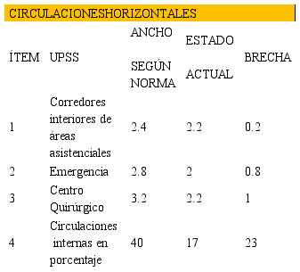 En relación con las circulaciones interiores en áreas asistenciales, la tabla 1 demuestra las brechas existentes en los anchos de los pasajes de las Unidades Prestadoras Servicios de Salud.