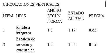 De la misma manera, la tabla 2 muestra las brechas en el ancho de espacios de circulación vertical escaleras principales y de evacuación o servicio.