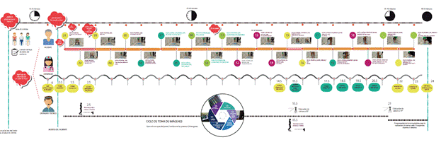 Fuente: M. F Vergara, O. Acosta, A. de la Serna (2018), Reporte de servicio social, CIDI UNAM.En esta segunda etapa, la información recopilada se analiza y se definen las necesidades o problemáticas a resolver. Para el caso de estudio se plasmó el procedimiento de toma de imágenes de forma visual en un mapa gráfico, donde se pueden observar los pasos, tiempos e interacciones de los tres actores principales: paciente, enfermera y personal que toma la imágen de termografía. A este tipo de visualizaciones en diseño se le ha llamado experience flow o en diseño de servicios customer journey map.[2] La finalidad de este tipo de mapas es que pueden ser entendidos por todas las disciplinas para generar una discusión al respecto. Muchas veces si el procedimiento médico es complejo, se generan estos mapas y deben ser revisados con el resto del equipo, con lo cual se convierten en una herramienta de indagación, ya que permiten recopilar más información.