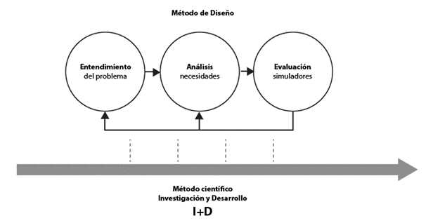 Fuente: Elaboración propia.El proceso de diseño antes descrito tiene similitudes con el método de Diseño Centrado en el Humano (Human Centered Design o HCD) (IDEO, 2015) y el Pensamiento de Diseño (Design Thinking) (Brown y Katz, 2009). En estos métodos se da especial relevancia al proceso de empatía o entendimiento del problema, así como a la realización de simuladores rápidos y la evaluación con usuarios y expertos en un proceso iterativo. Es importante aclarar que el proceso descrito en este artículo puede ser complementario de estos otros métodos, sin embargo, se consideran como características diferenciadoras las siguientes: