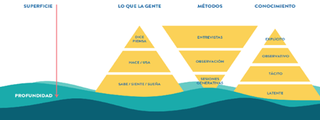 Fuente: Sanders y Stappers (2012: 67).El uso de la aproximación etnográfica en el diseño hizo posible la construcción de una metodología de investigación que da lugar a nuevas perspectivas dentro de la formación del diseñador. Su puesta en práctica se respalda en la triangulación de datos que permite que el proceso de investigación sea creíble, válido y confiable (figura 1), ésta se logra a partir de la implementación de distintos recursos (métodos, herramientas o técnicas) con el objetivo de obtener datos a partir de diversas fuentes, perspectivas y profundidades de conocimiento, que permiten construir una visión transversal del tema en estudio, y facilitan el análisis de convergencias y divergencias entre lo que dicen/hacen/sienten las personas, y lo que observa el investigador.