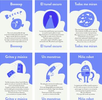 Para la fase de análisis e interpretación de datos, la investigación etnográfica se apoya en la teoría fundamentada como medio para descubrir los datos relevantes de determinados fenómenos sociales. En este proyecto, contribuyó a ordenar la información recabada para tener un mejor entendimiento del autismo y así construir los conceptos relevantes alrededor de las experiencias documentadas, la traducción de esta información al diseño se concretó al representar de manera abstracta cada uno de los conceptos y desarrollar un juego de tarjetas que contienen pequeños textos escritos en primera persona, con la finalidad de situar en los zapatos de un niño autista a la persona que los lea, el resultado fue una herramienta para empatizar[8] (figura 2).