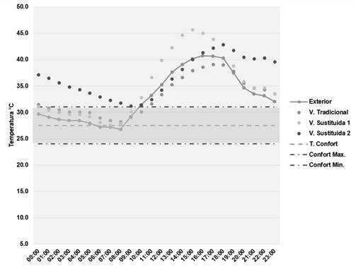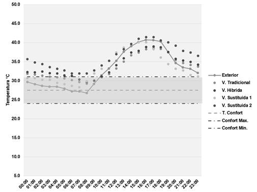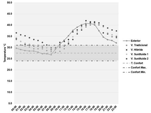 Según los resultados del monitoreo, efectuado durante la temporada 1, en el 2019, el día más cálido en la zona Teenek fue el viernes 23 de agosto, con una temperatura máxima ambiente de 40.8 °C al exterior y paradójicamente la VS2 muestra una máxima extrema interior de 42.5 °C, a su vez, la oscilación más baja al interior se registra en la VH con 7.6 °C (figura 4).
