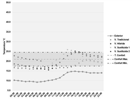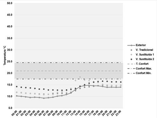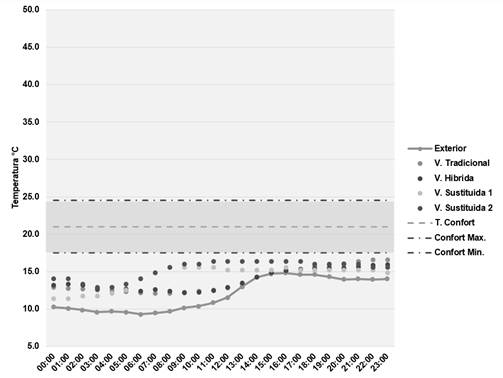 En la temporada considerada como fría, la temperatura exterior mínima registrada es de 9.3 °C, a su vez, la VS1 muestra al interior una mínima de 10.9 °C, y la VS2 de 12.7 °C. La oscilación térmica para esta temporada se determina en 7.9 °C, a su vez, la oscilación térmica mínima se registra en la VT con 5.3 °C y en la VS2 con 6.1 °C. La temperatura de confort establecida para esta temporada es de 21.0 °C y en su promedio mensual todos los prototipos monitoreados se mantienen por encima de esta zona de confort.