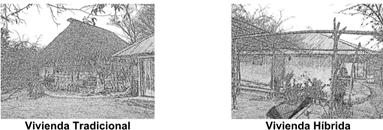 En cuanto a la Vivienda Híbrida VH su forma se caracteriza por el uso de la planta rectangular con techos inclinados a dos aguas. Los muros tradicionales de material vegetal se sustituyen por los industrializados como el block de cemento (0.12x0.20x0.40), y la cubierta vernácula se mantiene apoyada en una estructura de otate y recubierta de hoja de palma tejida. El uso del espacio interior es mono-espacial, similar al de la vivienda tradicional, la iluminación se mejora por el uso de ventanas, los pisos son de cemento y desaparece el uso del plafón, a base de varas de otate, y que ocasionalmente es utilizado en la vivienda tradicional para amortiguar el calor transmitido a través de la cubierta. La ventilación natural se logra principalmente a través de vanos en los muros, además del espacio abierto entre el enrace de muros y la estructura de la cubierta.