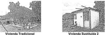 La Vivienda Sustituida, designada como VS1, se construye en parte con materiales industrializados como: el block de cemento en muros y la lámina galvanizada en cubiertas. Como estructura portante de las cubiertas se utilizan, tanto vigas de madera como otates de sección gruesa de 10 a 12 cm de diámetro y aunque no es una regla general el interior de la vivienda puede contar con un plafón de amortiguamiento térmico, elaborado con materiales vegetales como otate o carrizo. La temperatura al interior se incrementa al mediodía y por la tarde debido a la incidencia de radiación solar sobre la cubierta de lámina y la circulación del aire durante la época de calor es insuficiente para mover el aire caliente del interior. Por lo general, la vivienda es obscura debido a los espacios cerrados y el tamaño mínimo de vanos.