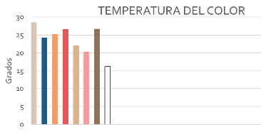 Fuente: Elaboración propia.Como se puede apreciar en la gráfica 1, existe diferencia entre la temperatura arrojada por cada uno de los colores de acuerdo con la información recabada, siendo el color beige el que presentó una temperatura más alta con un promedio de 28.56 ºC, y el color blanco el que presentó la temperatura más baja con un promedio de 16.2 ºC. La evaluación se realizó en época cálida y en horarios de intensa radiación solar, sin embargo, la información analizada confirma la influencia térmica que presenta el color en la arquitectura, específicamente, permite conocer, en este caso, el color conveniente a utilizar debido al promedio de temperatura ambiental que se presenta en la ciudad de San Luis Potosí.
