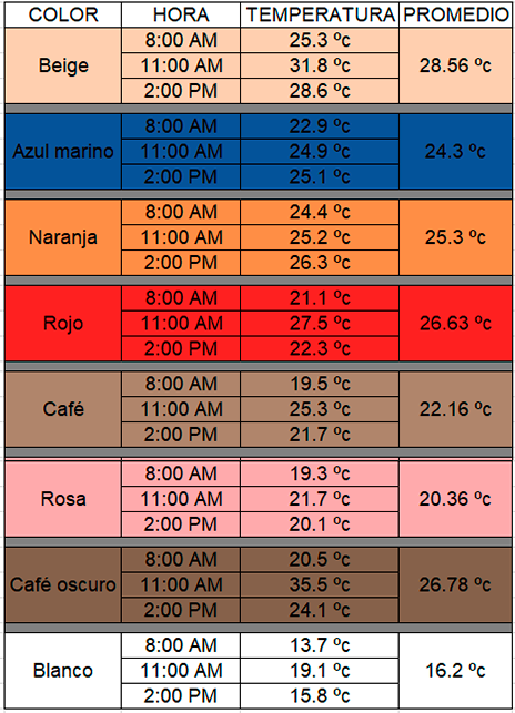 Para una mejor comprensión de la influencia de este dentro de la arquitectura, se hizo la selección de diversos colores plasmados en las instalaciones de la Facultad del Hábitat dentro de la Universidad Autónoma de San Luis Potosí, los cuales se midieron en tres diferentes horarios del día con el uso de un termómetro infrarrojo digital, de esta manera, se evalúa también de acuerdo con la radiación solar. Los datos recabados se clasificaron en la siguiente tabla para una mejor apreciación y entendimiento.
