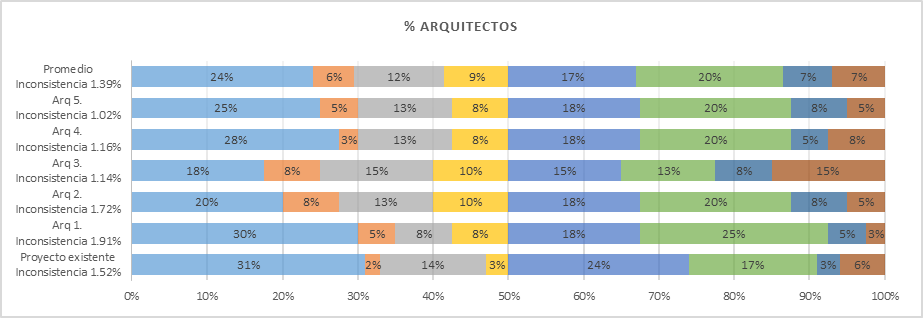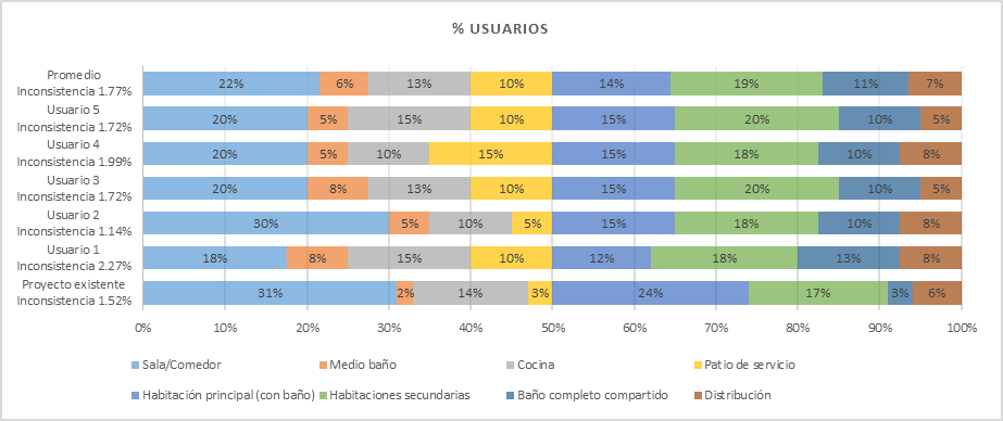 En lo referente al análisis porcentual del espacio destinado a cada área del proyecto, los resultados promedio de las expresiones de los arquitectos y usuarios (figura 7), es posible identificar que existieron grandes variaciones en lo individual en ambos grupos; al integrar el porcentaje de esta muestra el índice de inconsistencia en el caso de los arquitectos es menor con respecto al proyecto existente, pero en el caso de los usuarios la inconsistencia fue superior (especialmente en el caso de los baños, habitaciones y sala/comedor).