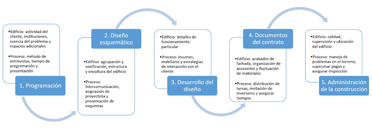 Fuente: Elaboración propia con base en Baker H. (1998).Finalmente, con respecto al estado del arte en los métodos para el proceso del diseño arquitectónico, Szilágyi & Bakai (2019) presenta una investigación que identifica los retos que los estudiantes de arquitectura hacen frente al diseñar, en este análisis se pretende determinar la manera en que las metodologías de diseño actuales han impactado a la eficiencia de diseño, tanto en actividades escolares como laborales; producto de su análisis identificaron tres etapas y problemáticas: concepción, elaboración y propuesta, en la primera uno de los elementos que presenta una mayor dificultad para los estudiantes es la modelización del sitio y el entorno, en la segunda la pérdida de tiempo en la traducción gráfica del diseño y la carencia de conocimiento en el software para representar, finalmente, en la tercera etapa, en la demanda de automatización existe pérdida de información debido a las técnicas de trabajo inapropiadas o poco eficientes.