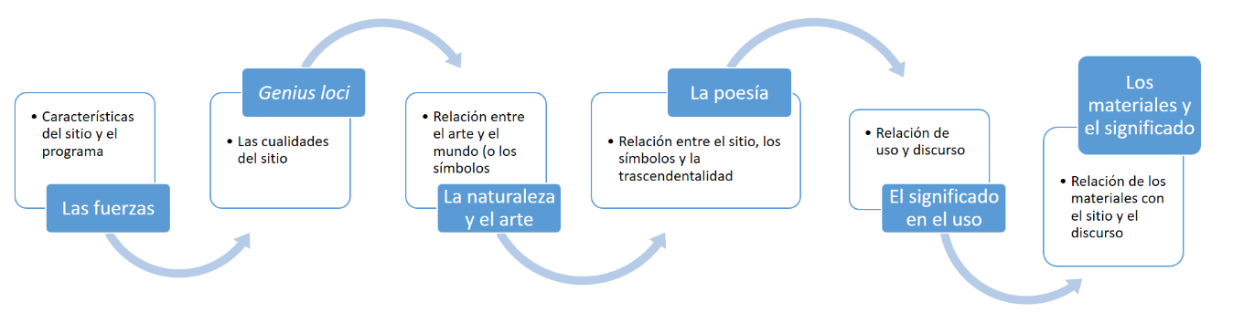 Fuente: Elaboración propia con base en T. White (1987: 14-15).Baker H. (1998) plantea que la arquitectura debe responder a las condiciones del lugar, los requisitos funcionales y la cultura, en lo concerniente a la función señala que el programa debe considerar la masa y geometría de los elementos a disponer (tanto materiales como inmateriales o actividades), por ello señala que el análisis para determinar un espacio comprenderá las fuerzas, el genius loci, la naturaleza y el arte, la poesía, el significado en el uso, los materiales y el significado, pero no presenta un método para realizar este proceso, como se muestra en la figura 2.