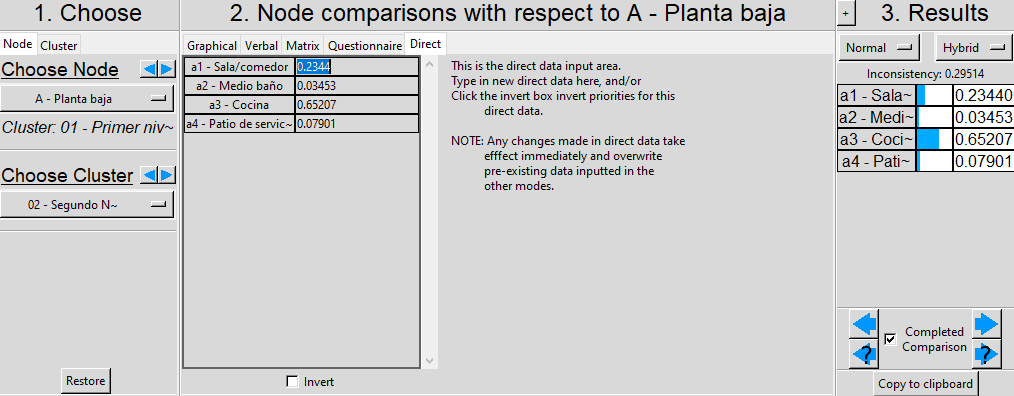 En lo particular se encontró una inconsistencia promedio de juicios expresados por los arquitectos de 1.39%, lo cual puede ser considerado dentro del índice de consistencia máximo (CI máx. 5% determinado por el número de variables o n) y con una consistencia mayor a la del proyecto existente (1.52%); mientras que en el caso de los usuarios este tuvo un promedio de 1.77%, es decir, una inconsistencia mayor que la de los juicios de los arquitectos, pero que también podría ser considerado un CI aceptable, en este caso no se realiza la elección de una alternativa, sino más bien se establece la partida de una distribución de un programa arquitectónico basado en las prioridades expresadas, por lo cual el índice de inconsistencia obtenido en ambos planteamientos por el programa super decisions solamente es un parámetro de medición del eigenvector de las prioridades expresadas por el individuo.