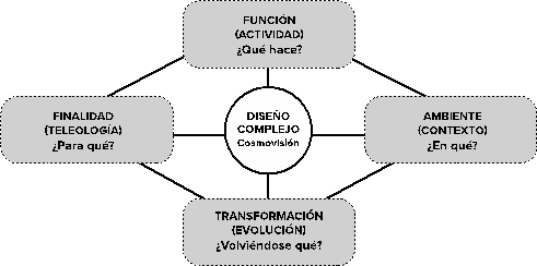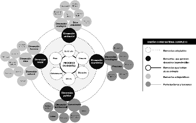 La naturaleza siempre cambiante de la disciplina del diseño –aunado a las modificaciones y transformaciones que debe asumir para contextualizar su accionar, así como la pluralidad de los discursos que se plantean a su alrededor– nos inducen a pensar en su relación con los sistemas complejos, que son en esencia “sistemas adaptativos, cargados de incertidumbre, pero con una alta capacidad de respuesta y recuperación” (Malo, 2016: 140) y contemplar la diversidad de actores, factores y componentes que los conforman. Por otra parte, a la necesidad de integrar los principios de sostenibilidad en su proceso lógico, los cuales se encuentran estrechamente vinculados a la vida, a la adaptabilidad humana y a su hábitat.
